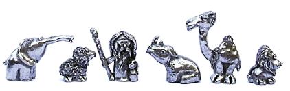 As peças foram esculpidas por nosso designer, e são fundidas em estanho, sendo que podem ter o acabamento em prata ou ouro velho. A Arca tem 75mm de largura, 60mm de altura e pesa 230 gramas. As miniaturas têm entre 20 e 30mm de altura.